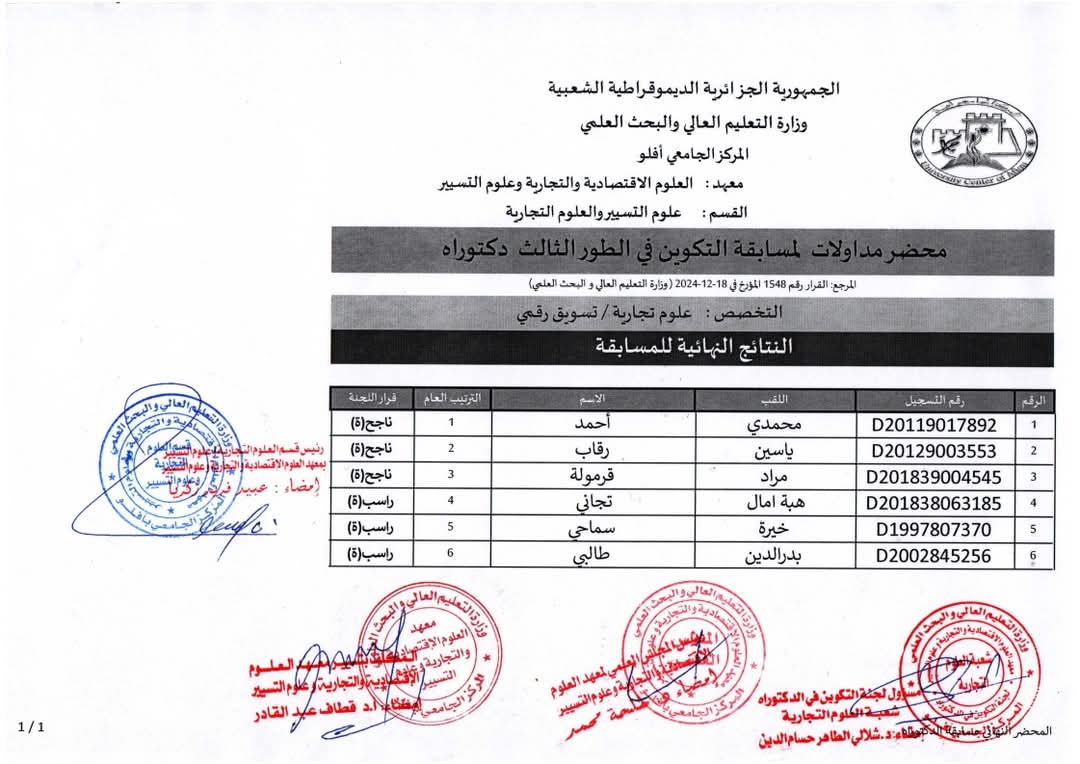 نتائج المسابقة الوطنية للدكتوراه الطور الثالث ( LMD) 2024/2025 شعبة علوم تجارية تخصص تسويق رقمي