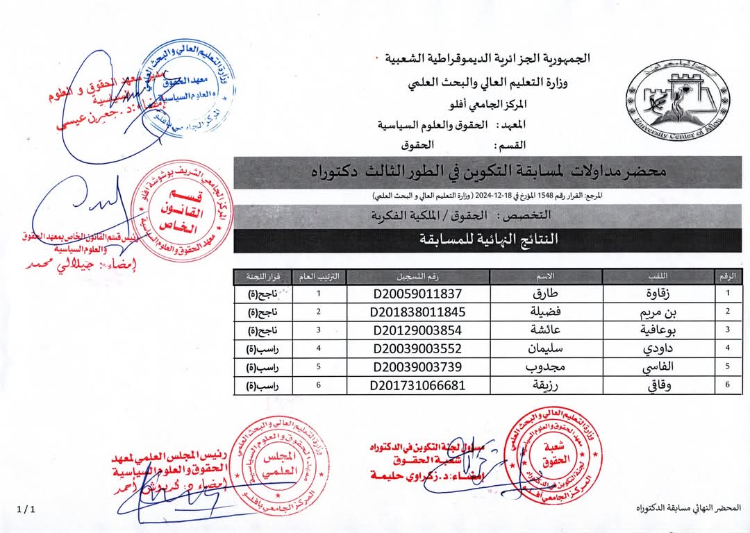 نتائج المسابقة الوطنية للدكتوراه الطور الثالث ( LMD) 2024/2025 شعبة الحقوق تخصص ملكية فكرية