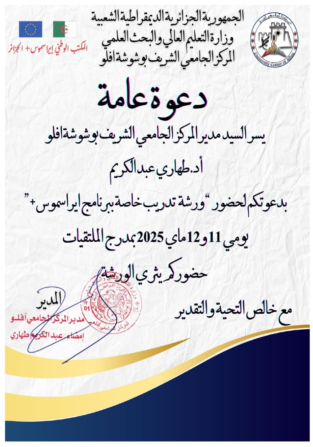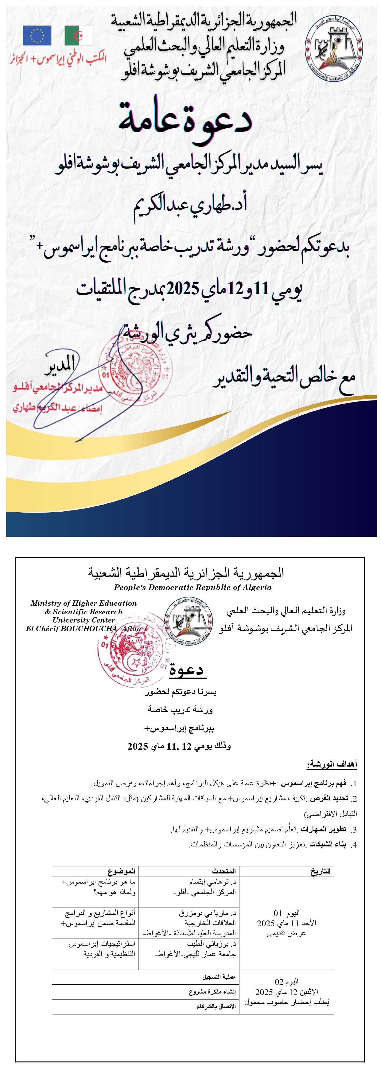 دعوة لحضور الورشة الخاصة ببرنامج إيراسموس يومي 11 و 12 ماي 2025