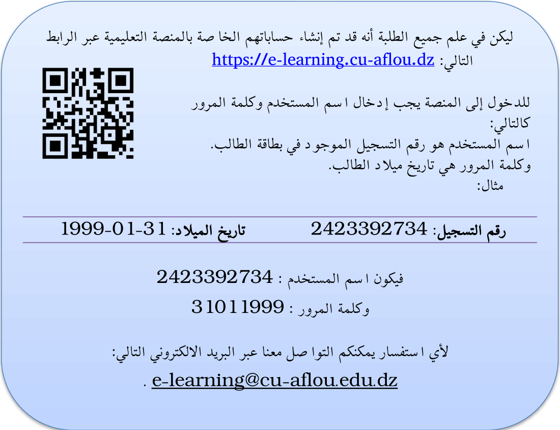 حسابات الطلبة الخاصة بالمنصة التعليمية للمركز الجامعي آفلو
