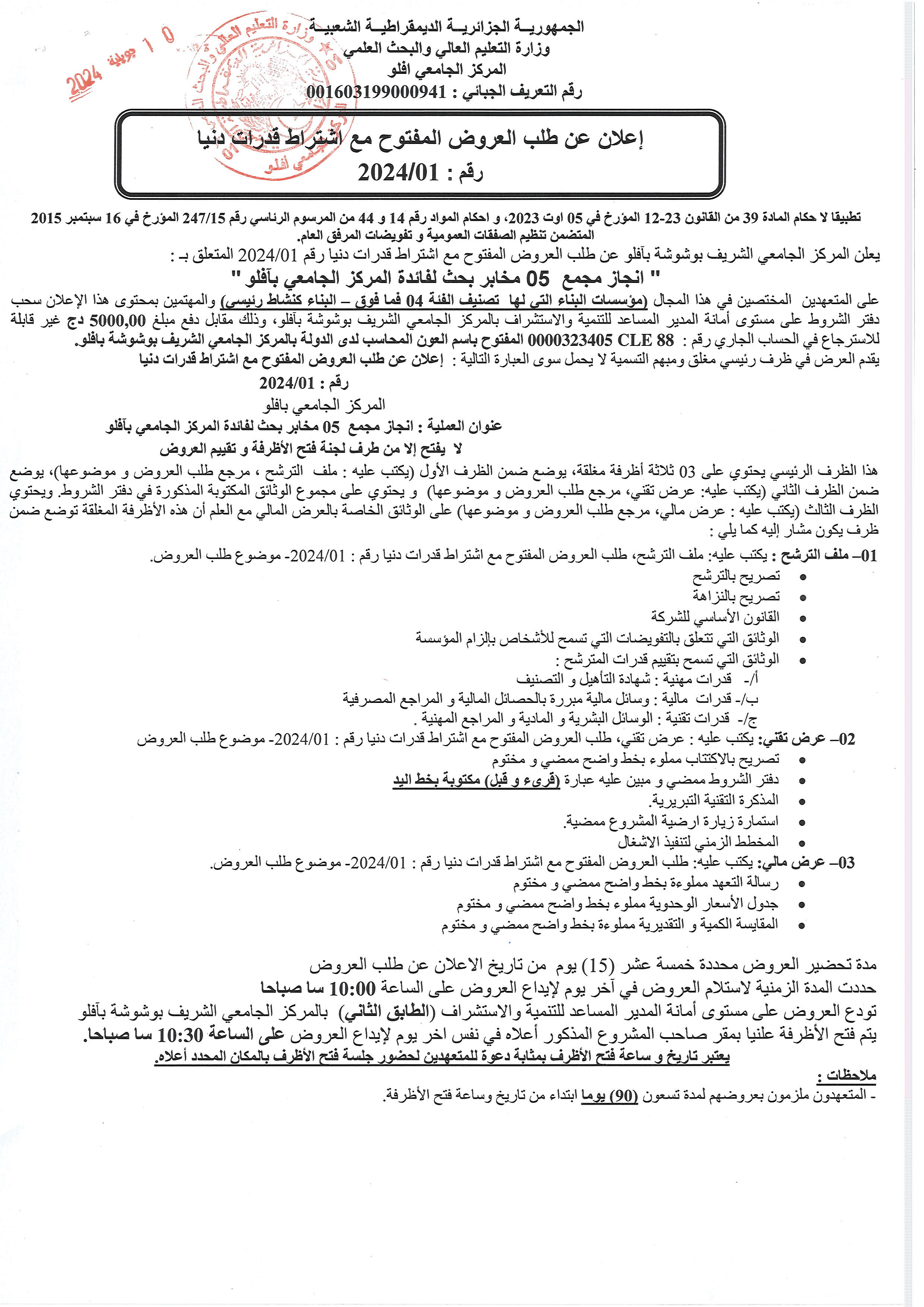اعلان طلب عروض انجاز 05 مخابر بحث