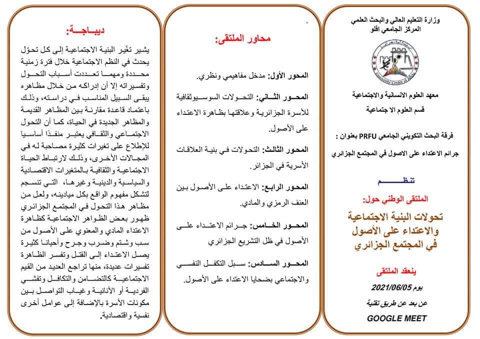 الملتقى الوطني: تحولات البنية الاجتماعية والاعتداء على الأصول في المجتمع الجزائري