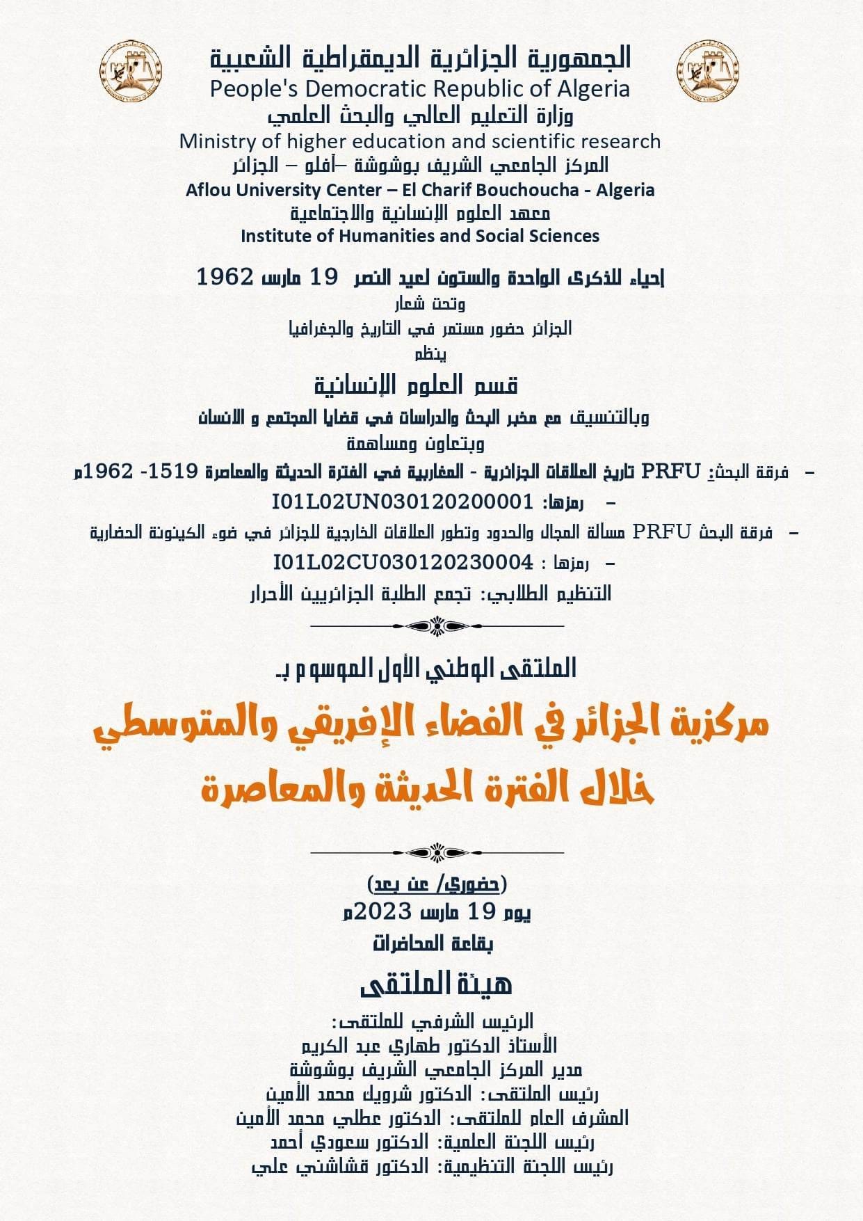 الملتقى الوطني الأول الموسوم ب: مركزية الجزائر في الفضاء المتوسطي والافريقي .