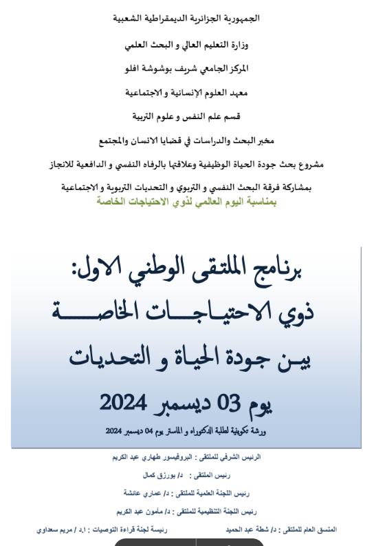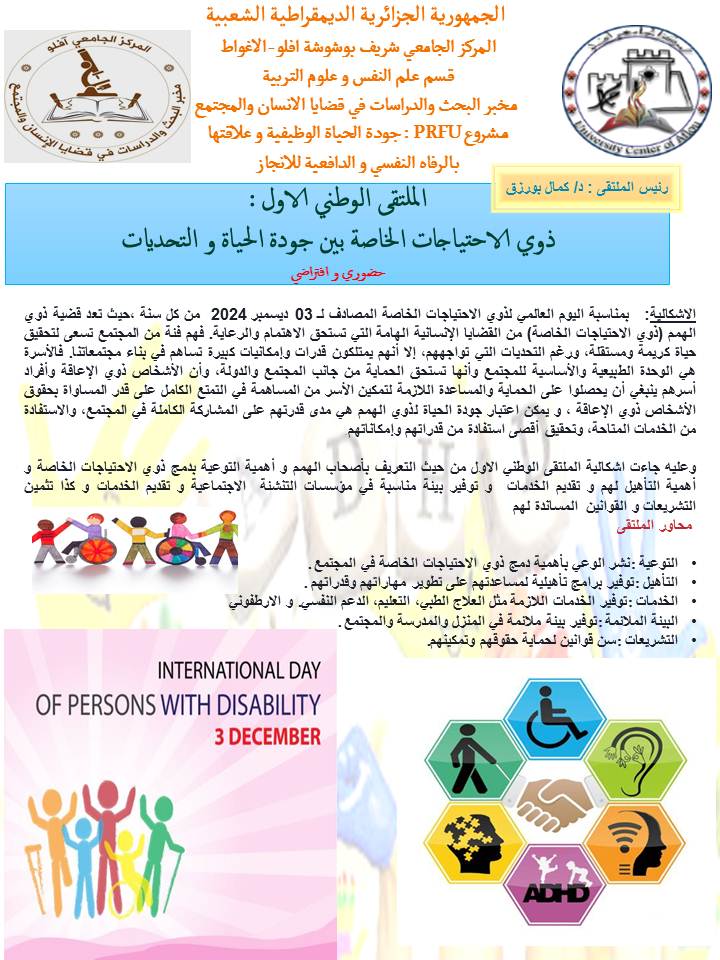 الملتـقى الوطني الاول: ذوي الاحتياجات الخاصة بين جـودة الحياة و التحـديات يوم 03 ديسمبر 2024