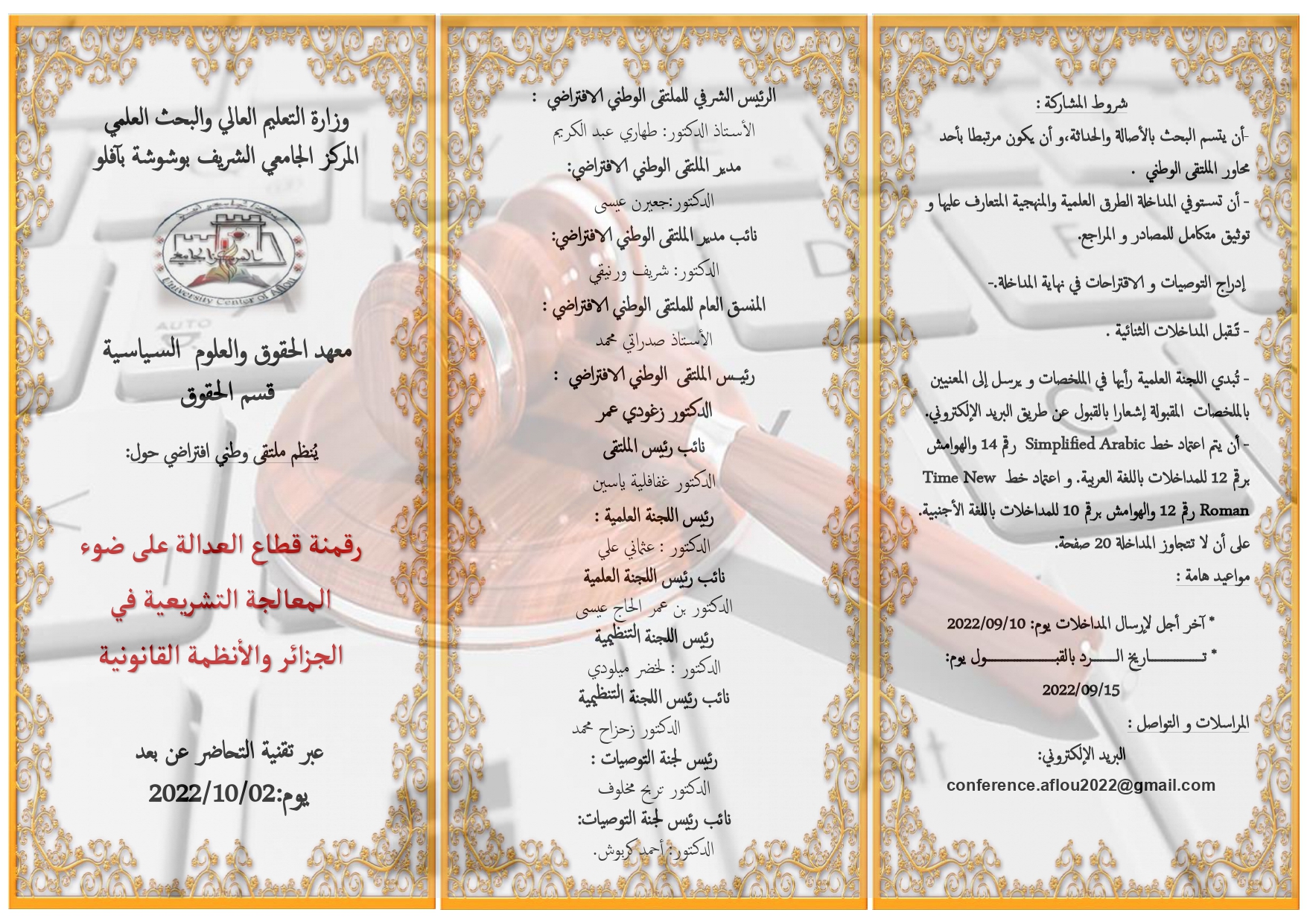 ملتقى وطني حول: رقمنة قطاع العدالة على ضوء المعالجة التشريعية في الجزائر والأنظمة القانونية بتاريخ 09 أكتوبر 2022