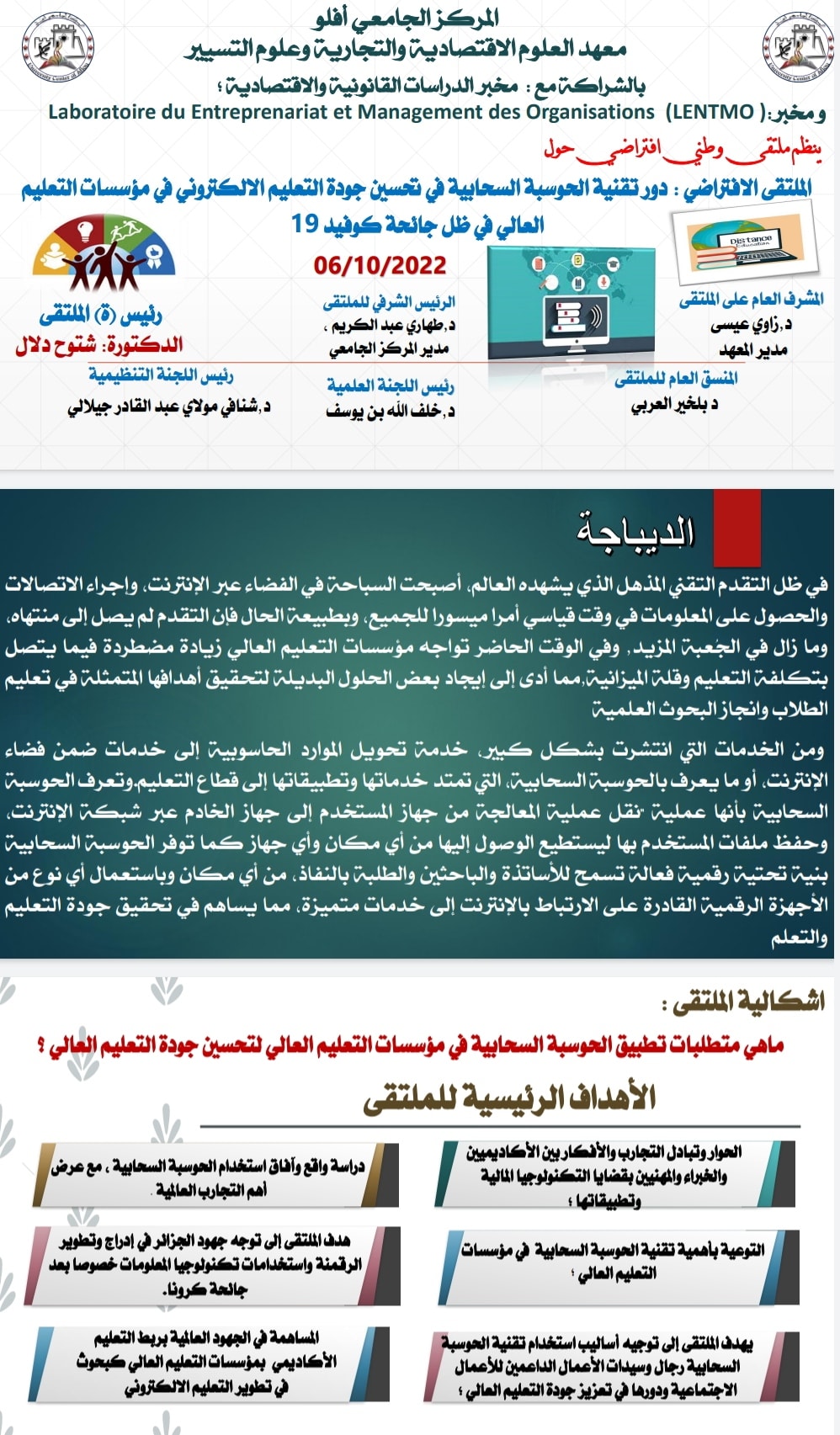 ينظم معهد العلوم الاقتصادية وعلوم التسيير والعلوم التجارية بالمركز الجا2022 الملتقى الوطني الافتراضي حول: دور تقنية الحوسبة السحابية في تحسين جودة التعليم الإلكتروني في مؤسسات التعليم العالي في ظل جائحة كوفيد 19.