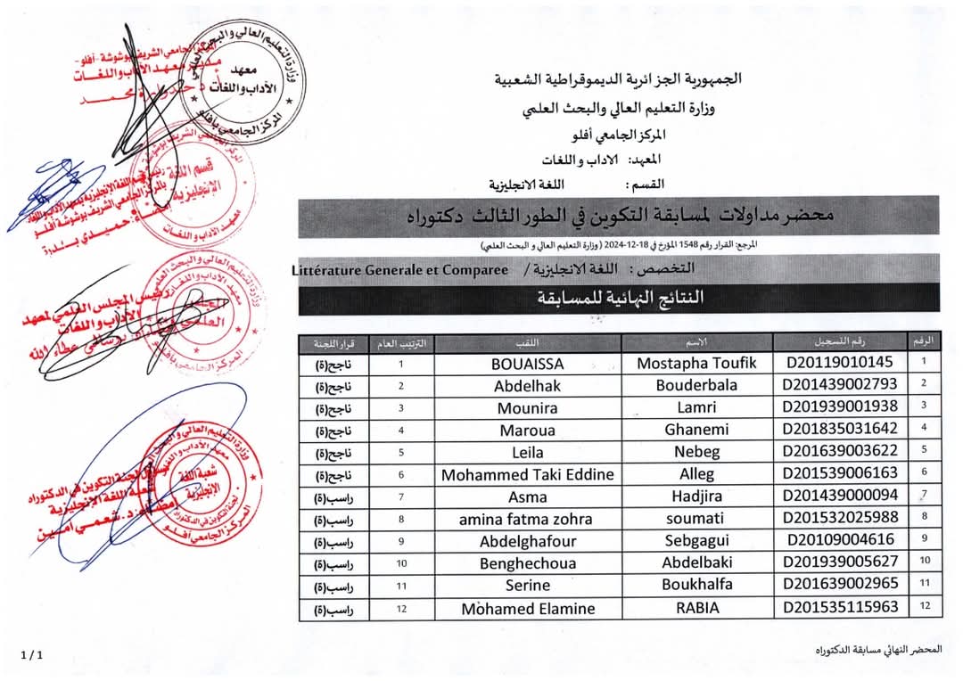 نتائج المسابقة الوطنية للدكتوراه الطور الثالث ( LMD) 2024/2025 شعبة لغة إنجلزية تخصص تعلمية اللغة الإنجليزية تخصص أدب عام ومقارب