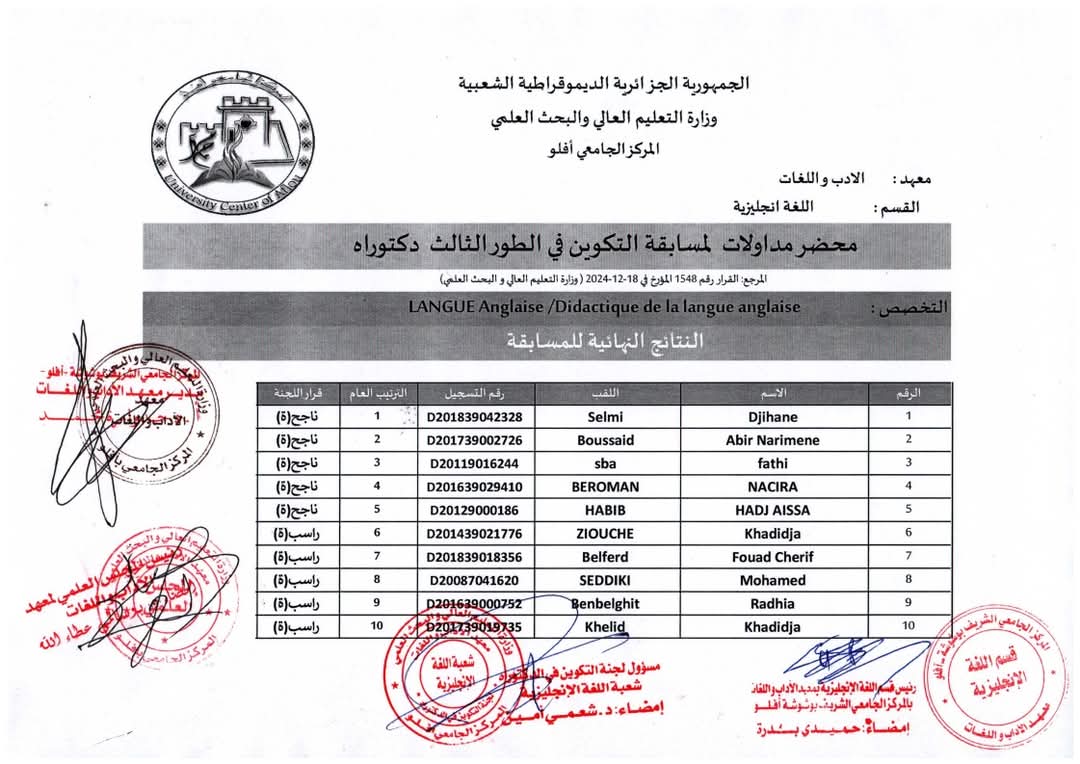نتائج المسابقة الوطنية للدكتوراه الطور الثالث ( LMD) 2024/2025 شعبة لغة إنجليزية تخصص تعليمية اللغة الإنجليزية
