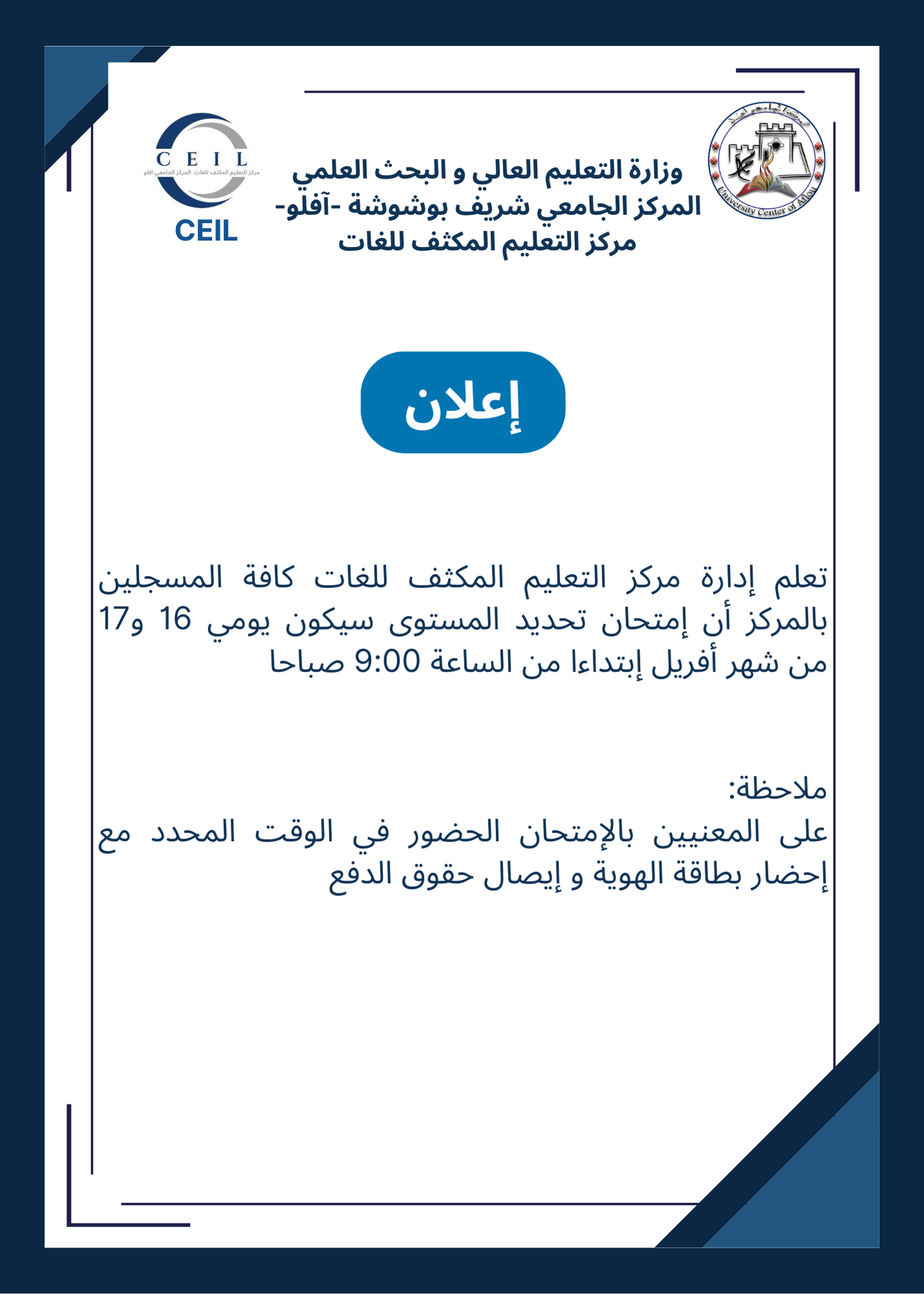تعلم إدارة مركز التعليم المكثف للغات كافة المسجلين بالمركز أن إمتحان تحديد المستوى سيكون يومي 16 و17 من شهر أفريل إبتداءا من الساعة 9:00 صباحا ملاحظة: على المعنيين بالإمتحان الحضور في الوقت المحدد مع إحضار بطاقة الهوية و إيصال حقوق الدفع